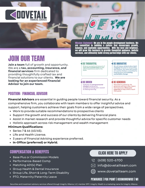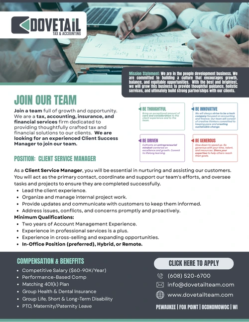 Mission Statement: We are in the people development business. We are committed to building a culture that encourages growth, balance, and equitable opportunities. With the best and brightest, we will grow this business to provide thoughtful guidance, holistic services, and ultimately build strong partnerships with our clients.